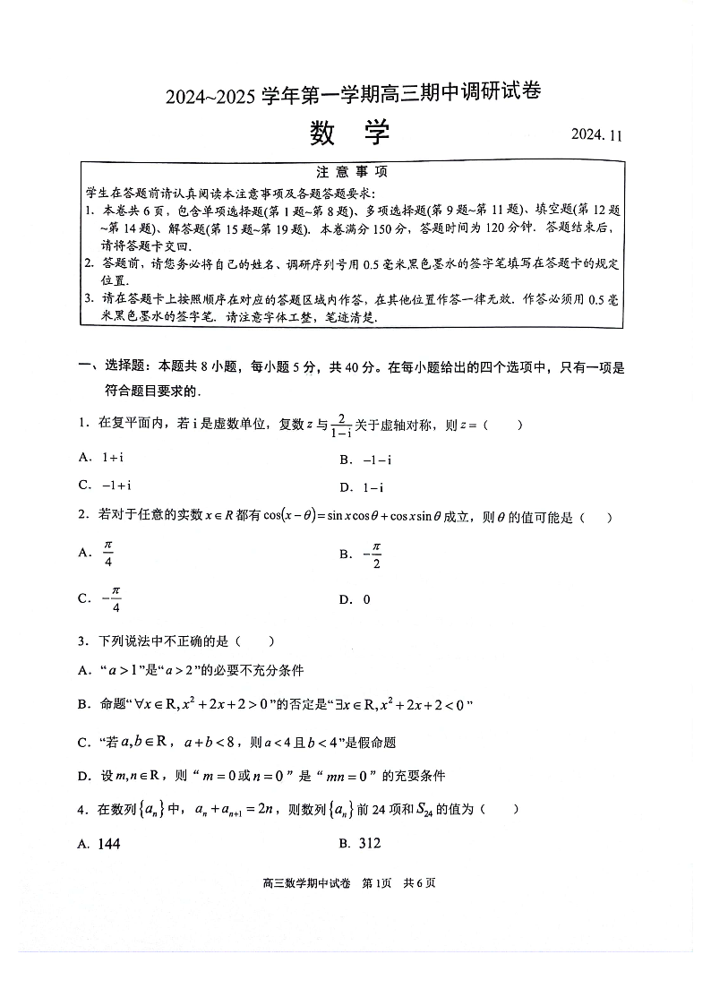 江苏省苏州市2025届高三上学期11月期中调研考试卷 数学