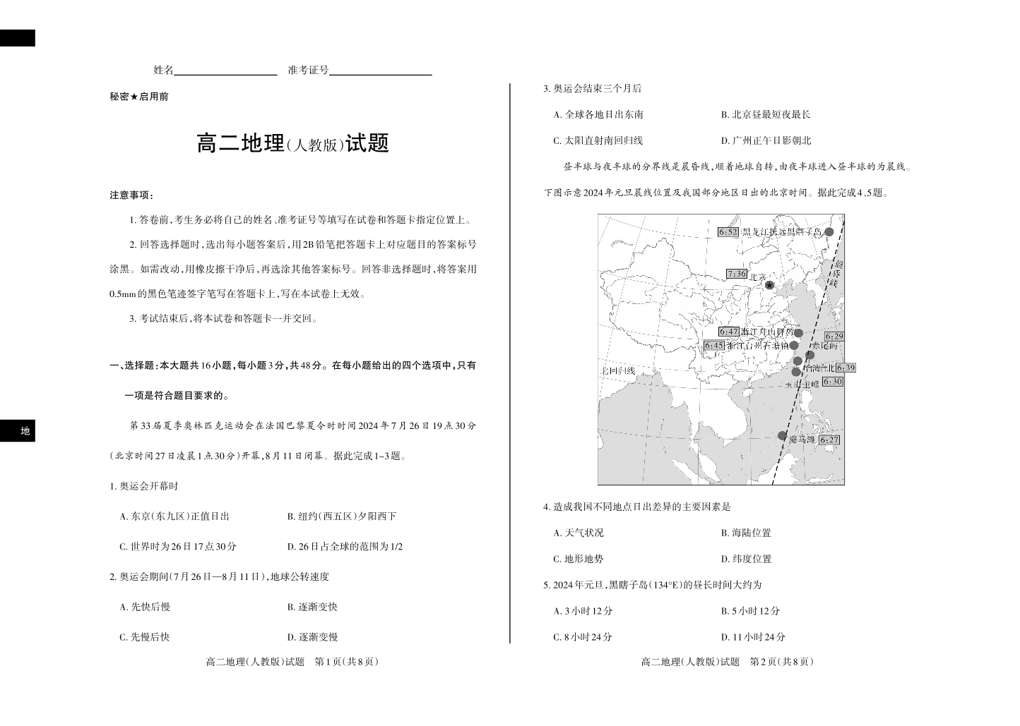 地理(人教)2024-2025高二第一学期期中考试