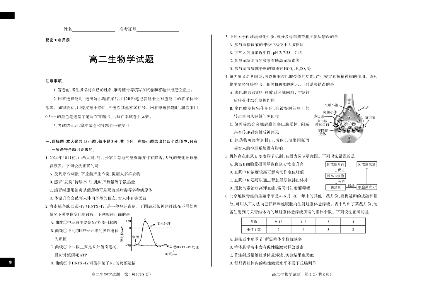 生物学 2024-2025高二第一学期期考试