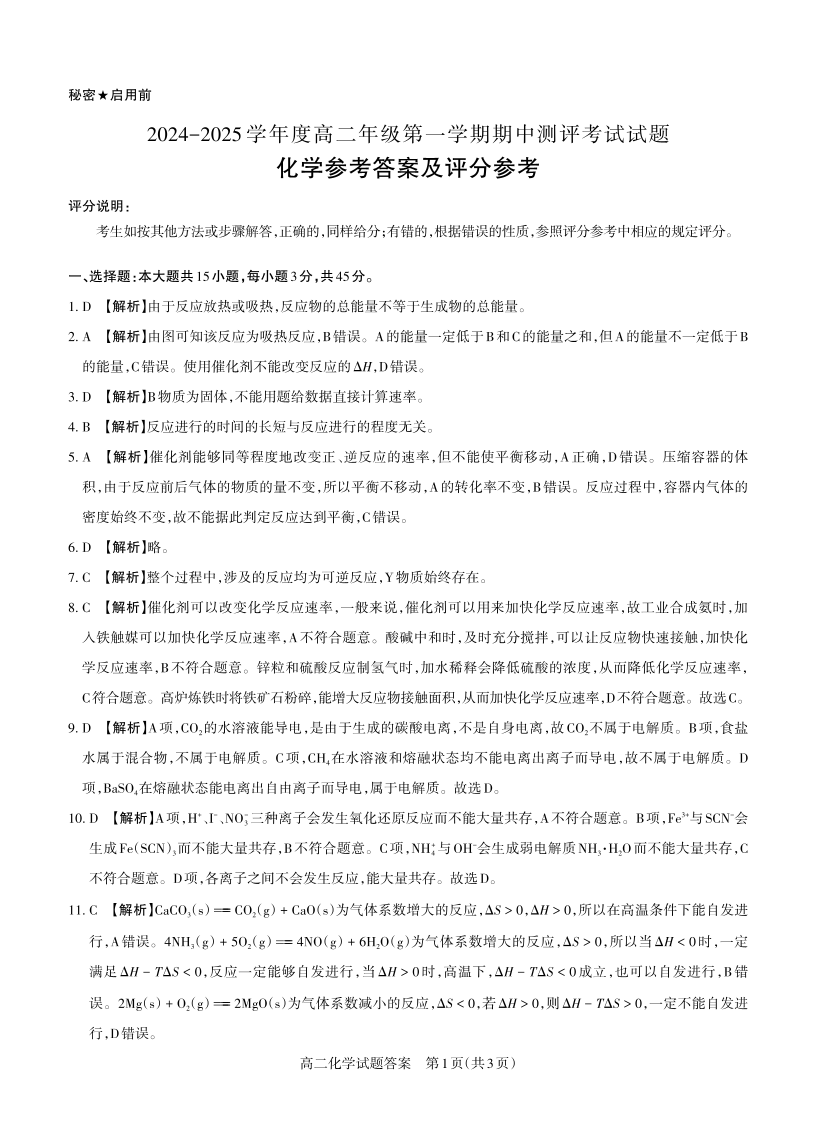 化学 2024-2025高二第一学期期中考试答案及详解