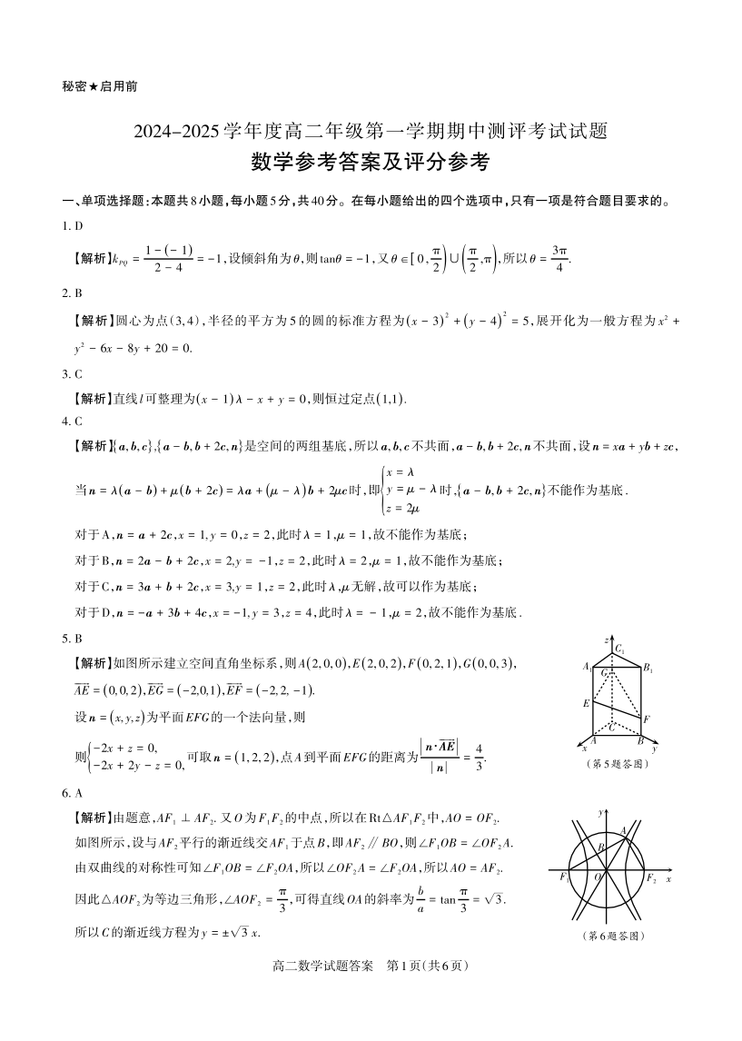 数学 2024-2025高二第一学期期中考试答案详解