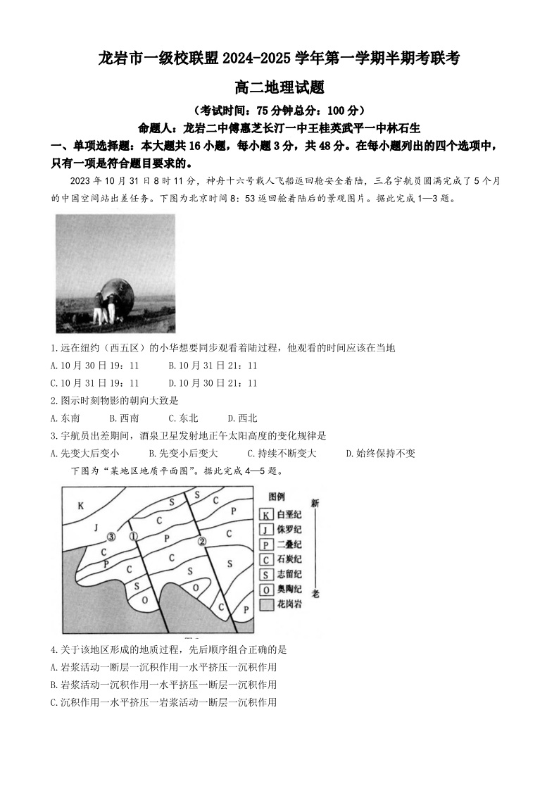 福建省龙岩市一级校联盟2024-2025学年高二上学期11月期中联考 地理