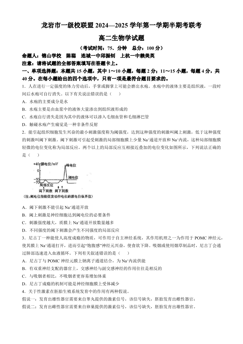 福建省龙岩市一级校联盟2024-2025学年高二上学期11月期中联考 生物