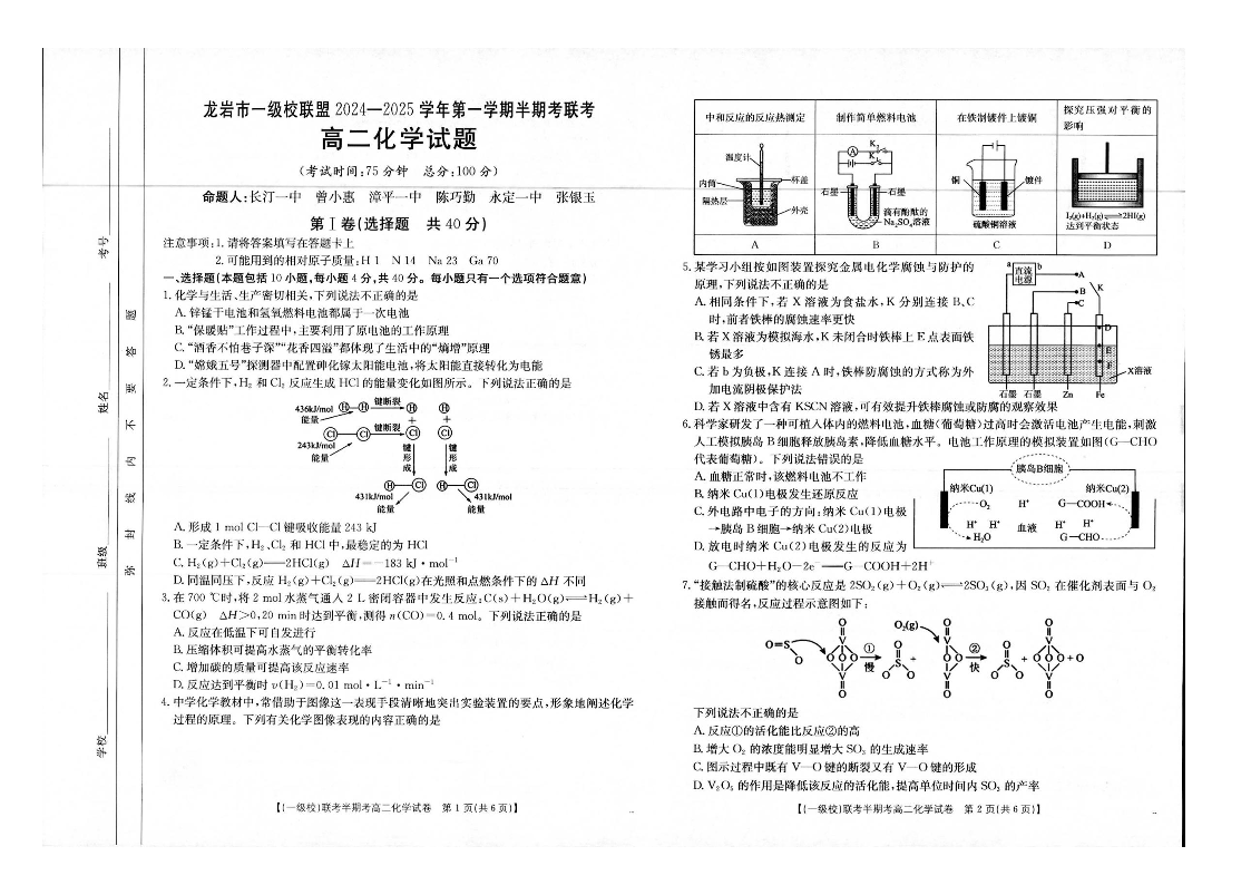 福建省龙岩市一级校联盟2024-2025学年高二上学期11月期中联考 化学