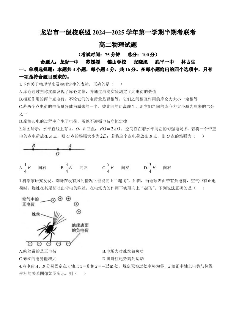 福建省龙岩市一级校联盟2024-2025学年高二上学期11月期中联考 物理