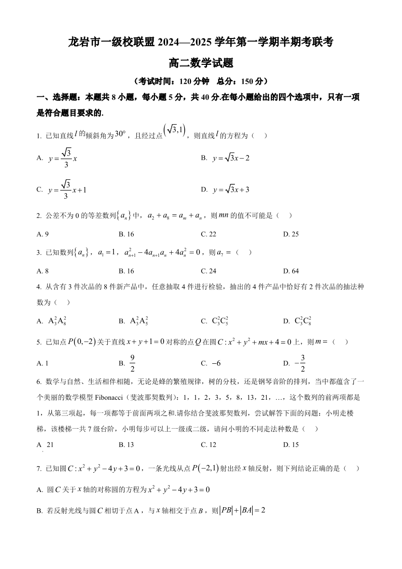 福建省龙岩市一级校联盟2024-2025学年高二上学期11月期中联考 数学