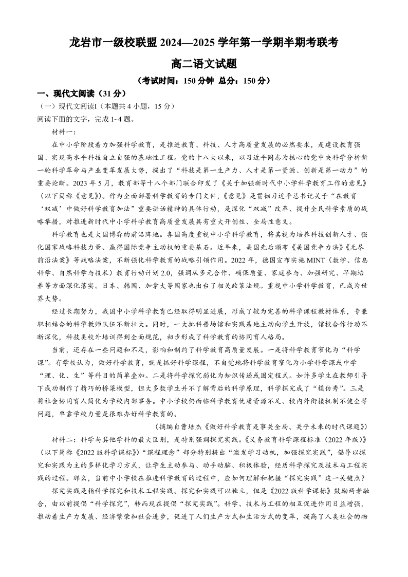 福建省龙岩市一级校联盟2024-2025学年高二上学期11月期中联考 语文