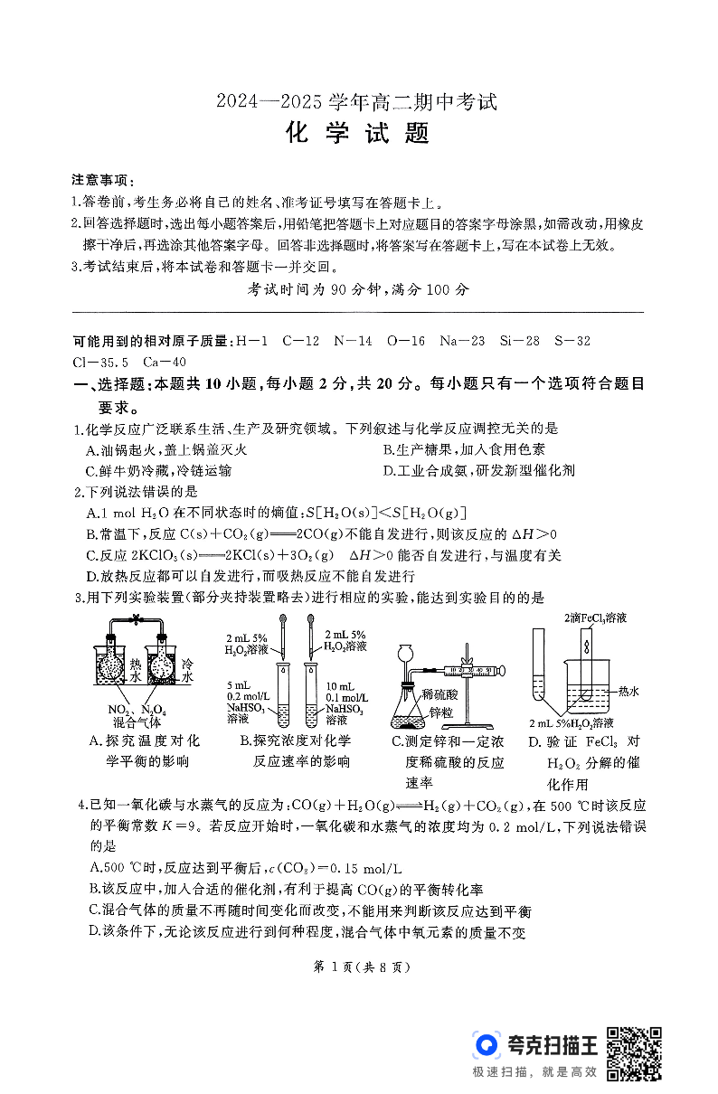 山东省百师联考2024-2025学年高二上学期期中考试 化学