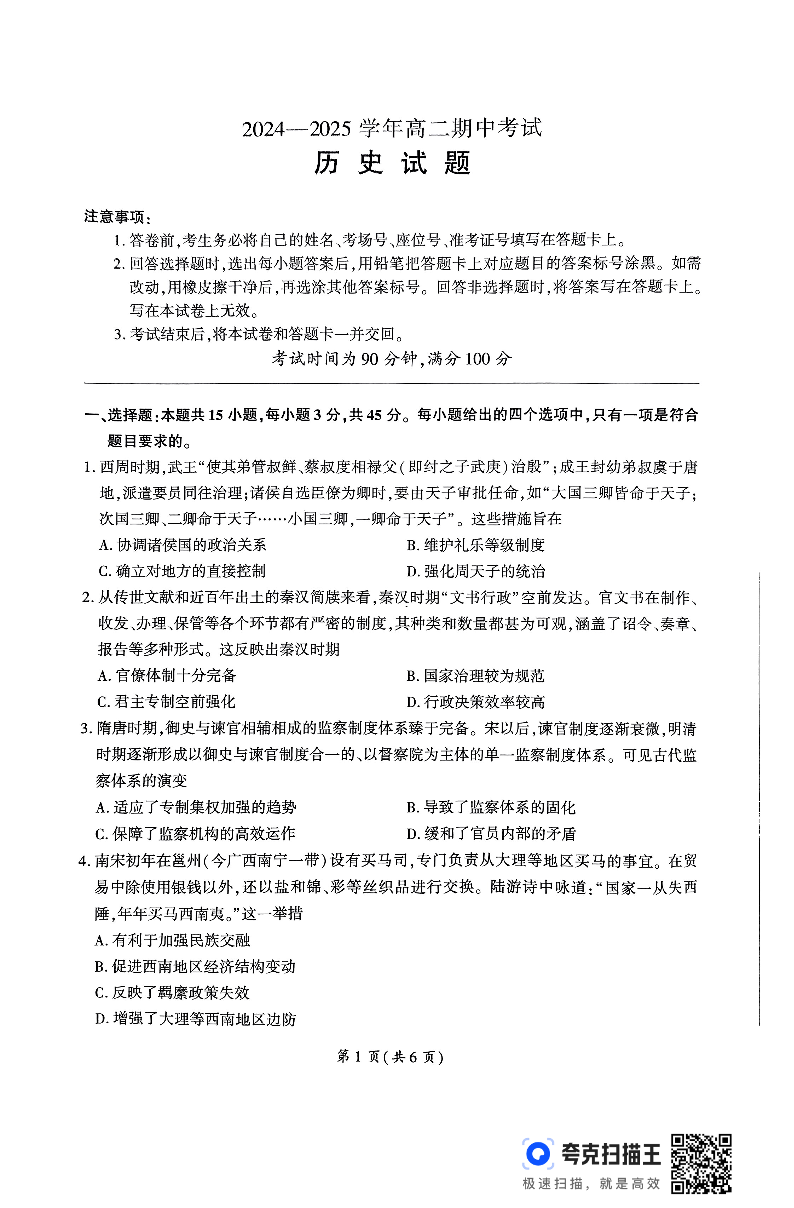 山东省百师联考2024-2025学年高二上学期期中考试 历史