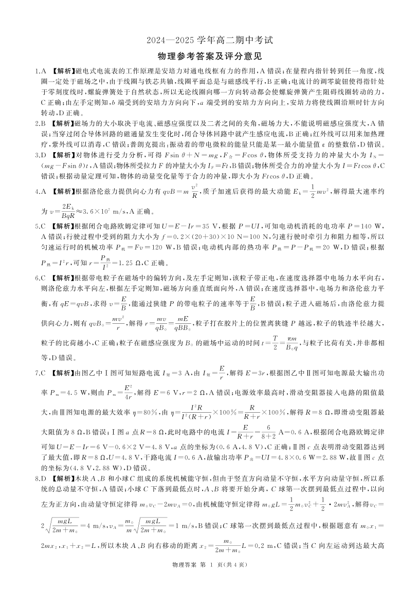 山东省百师联考2024-2025学年高二上学期期中考试 物理答案