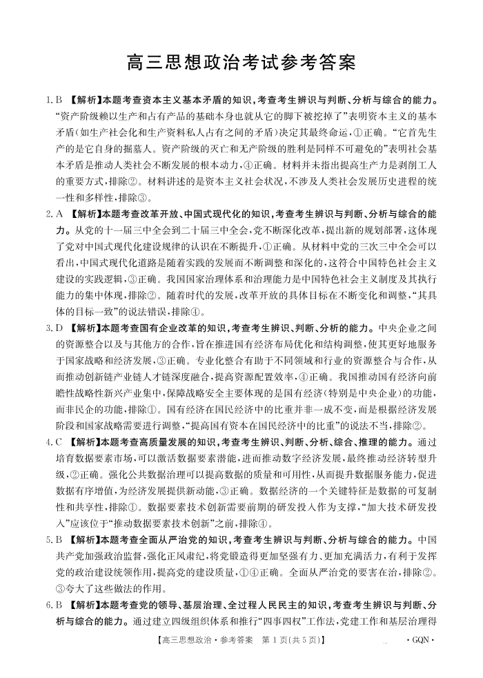甘肃省白银市靖远县2025届高三上学期第一次全县联考(一模)政治答案