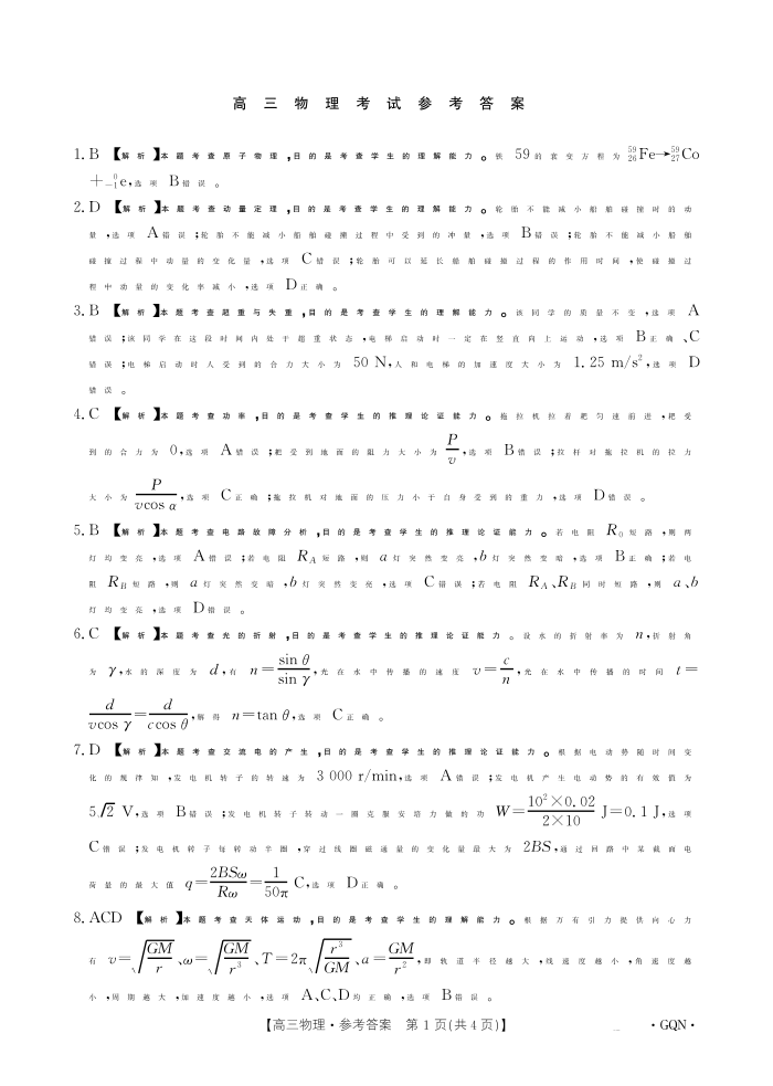 甘肃省白银市靖远县2025届高三上学期第一次全县联考(一模)物理答案