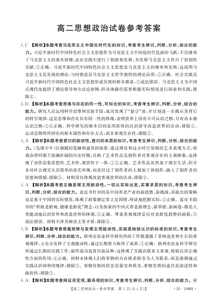 四川省雅安中学2024-2025学年高二上学期11月期中考试 政治答案