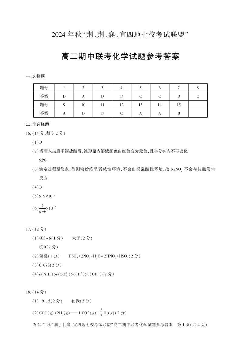 2024年秋“荆、荆、襄、宜四地七校考试联盟”高二年级期中联考 化学答案