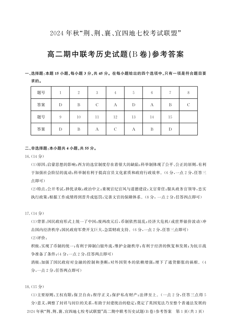 2024年秋“荆、荆、襄、宜四地七校考试联盟”高二年级期中联考 历史答案(B)
