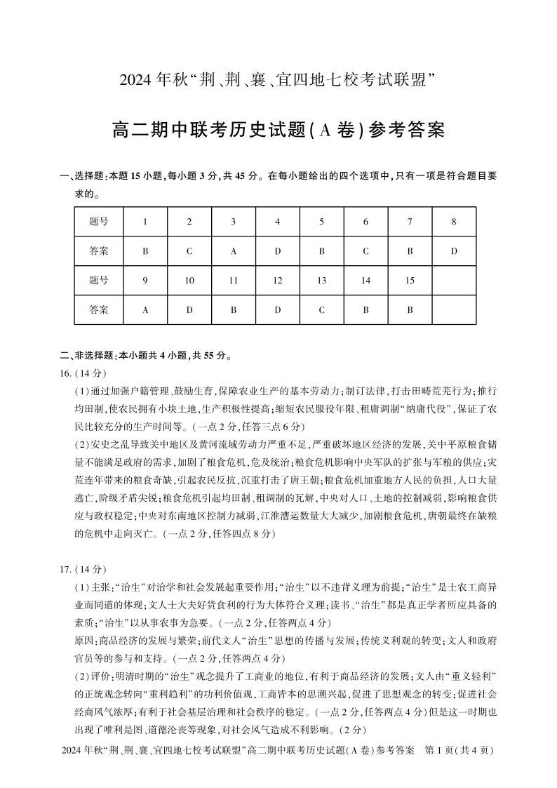 2024年秋“荆、荆、襄、宜四地七校考试联盟”高二年级期中联考 历史答案(A)