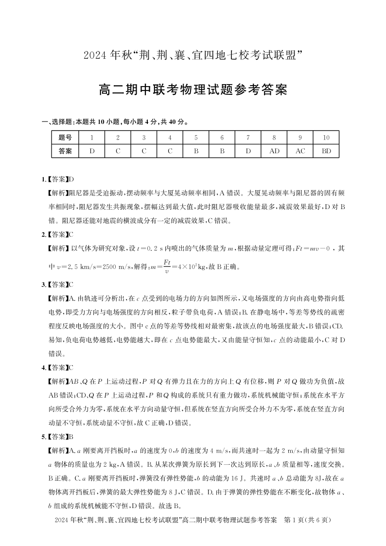 2024年秋“荆、荆、襄、宜四地七校考试联盟”高二年级期中联考 物理答案