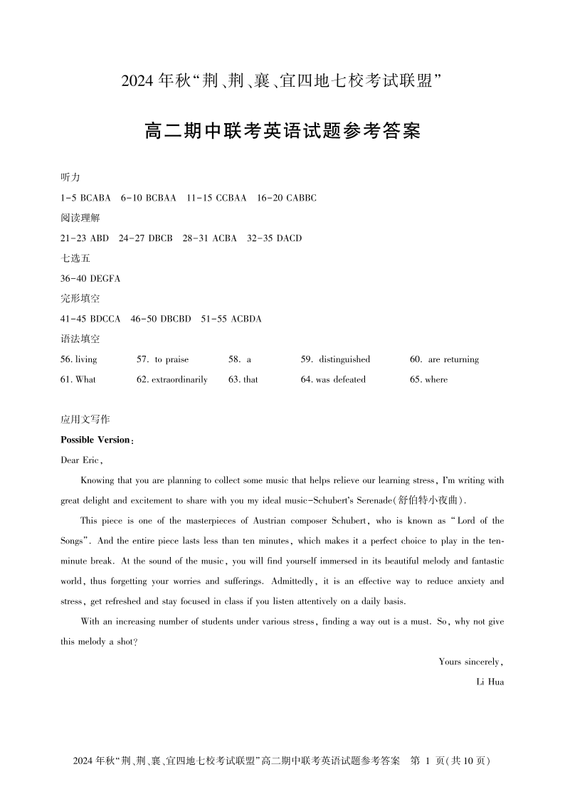 2024年秋“荆、荆、襄、宜四地七校考试联盟”高二年级期中联考 英语答案