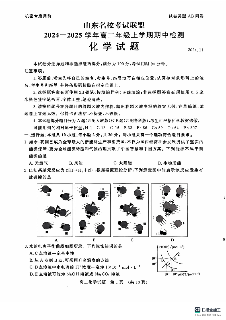 山东省名校考试联盟2024-2025学年高二上学期期中考试 化学
