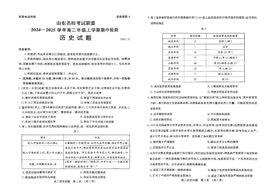 山东省名校考试联盟2024-2025学年高二上学期期中考试 历史