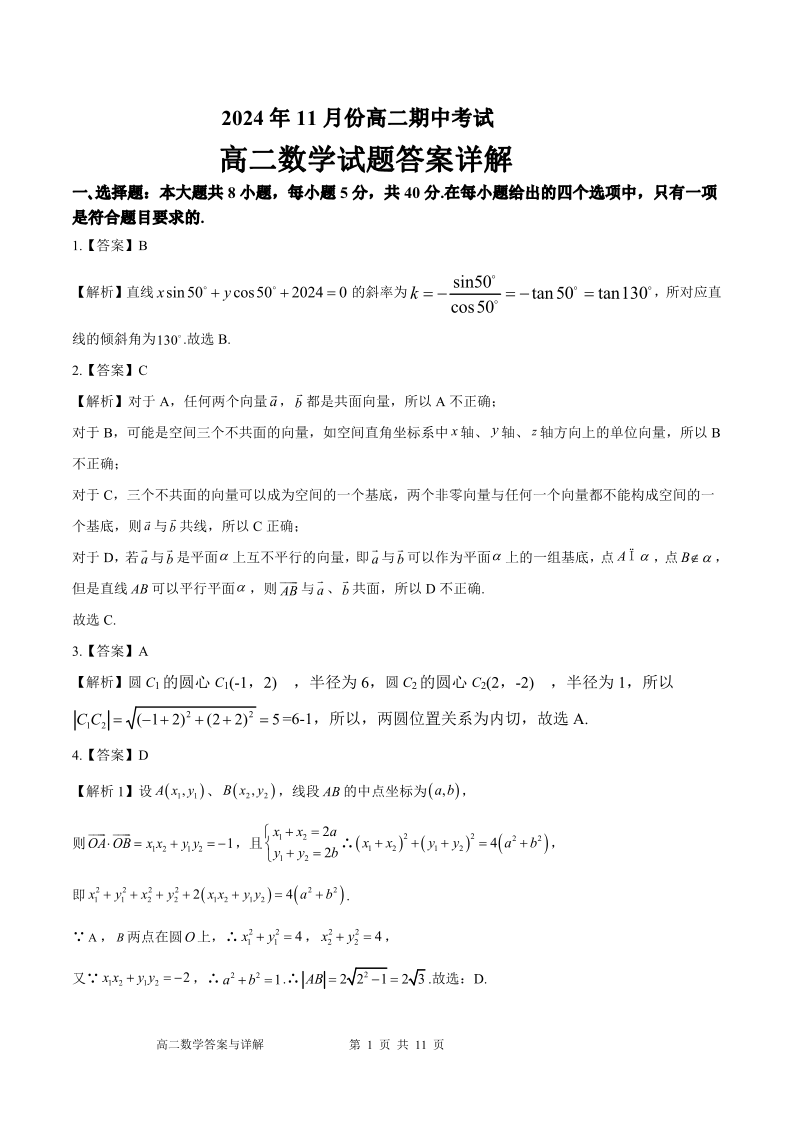 山东省名校考试联盟2024-2025学年高二上学期期中考试 数学答案