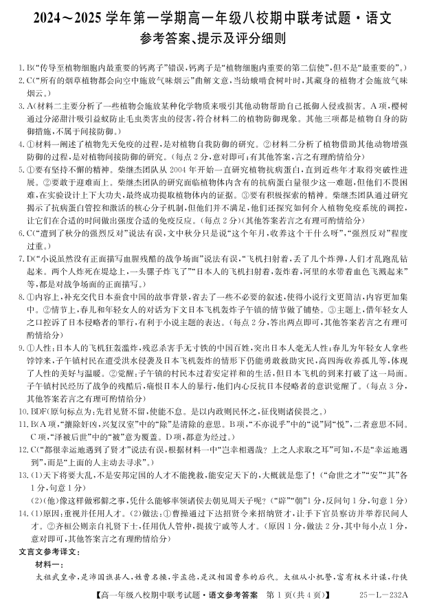 陕西省榆林市八校2024-2025学年高一上学期期中联考 语文答案