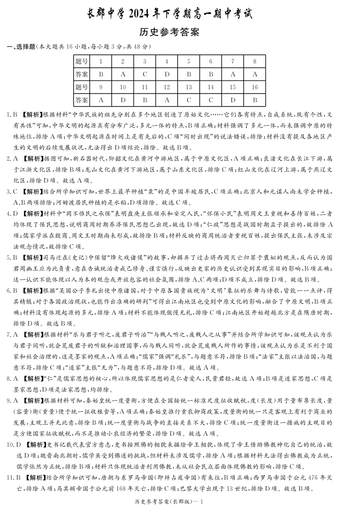 湖南省长沙市长郡中学2024-2025学年高一上学期期中考试 历史答案