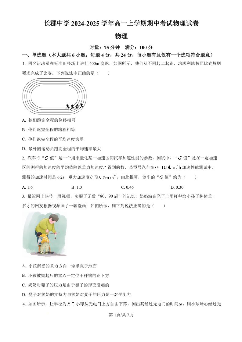 湖南省长沙市长郡中学2024-2025学年高一上学期期中考试 物理