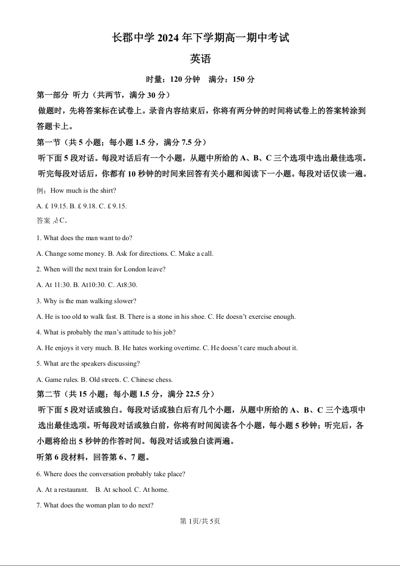 湖南省长沙市长郡中学2024-2025学年高一上学期期中考试 英语答案