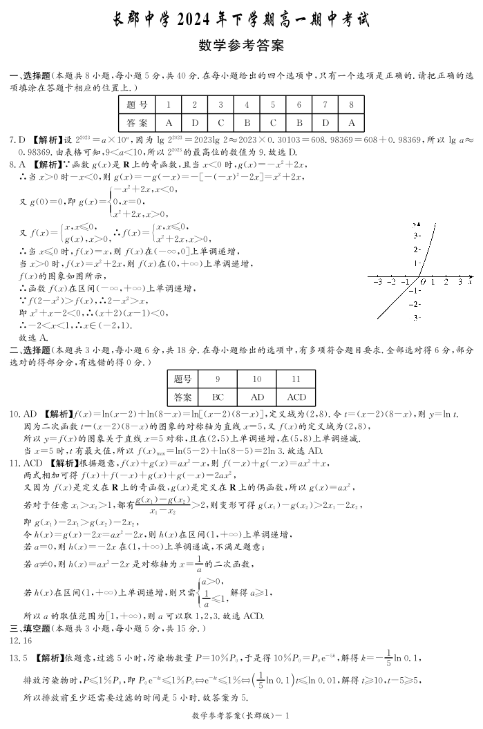 湖南省长沙市长郡中学2024-2025学年高一上学期期中考试 数学答案