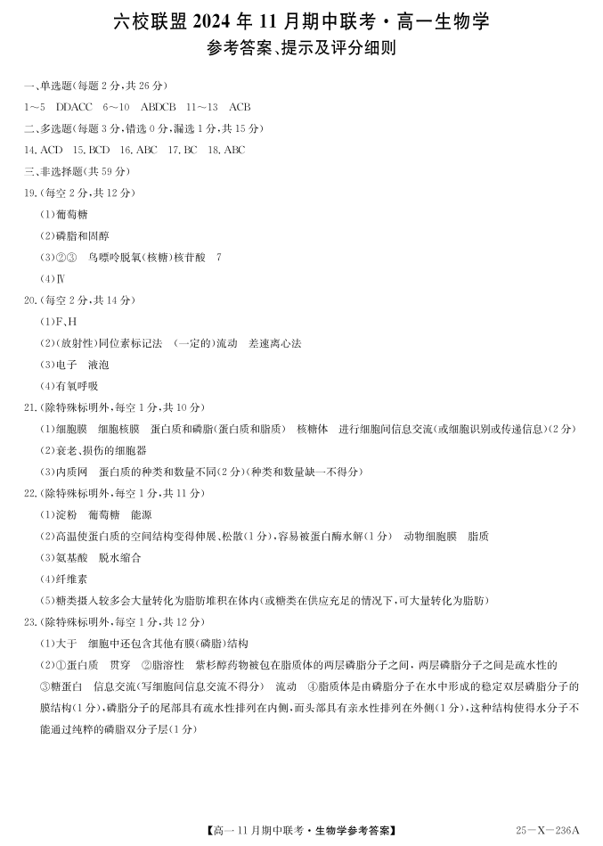 河北省保定市六校联盟2024年11月期中联考 生物答案