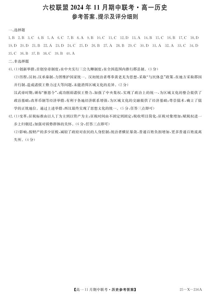 河北省保定市六校联盟2024年11月期中联考 历史答案