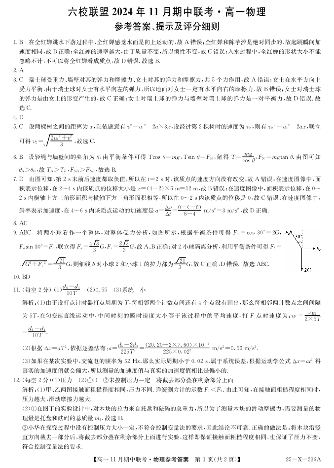 河北省保定市六校联盟2024年11月期中联考 物理答案
