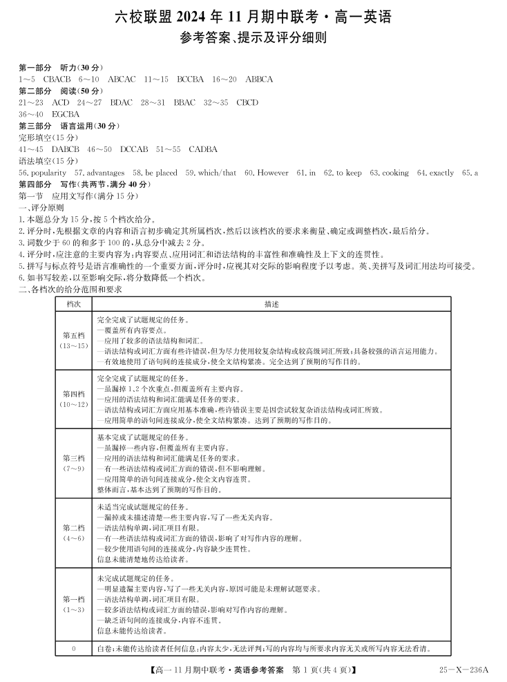 河北省保定市六校联盟2024年11月期中联考 英语答案