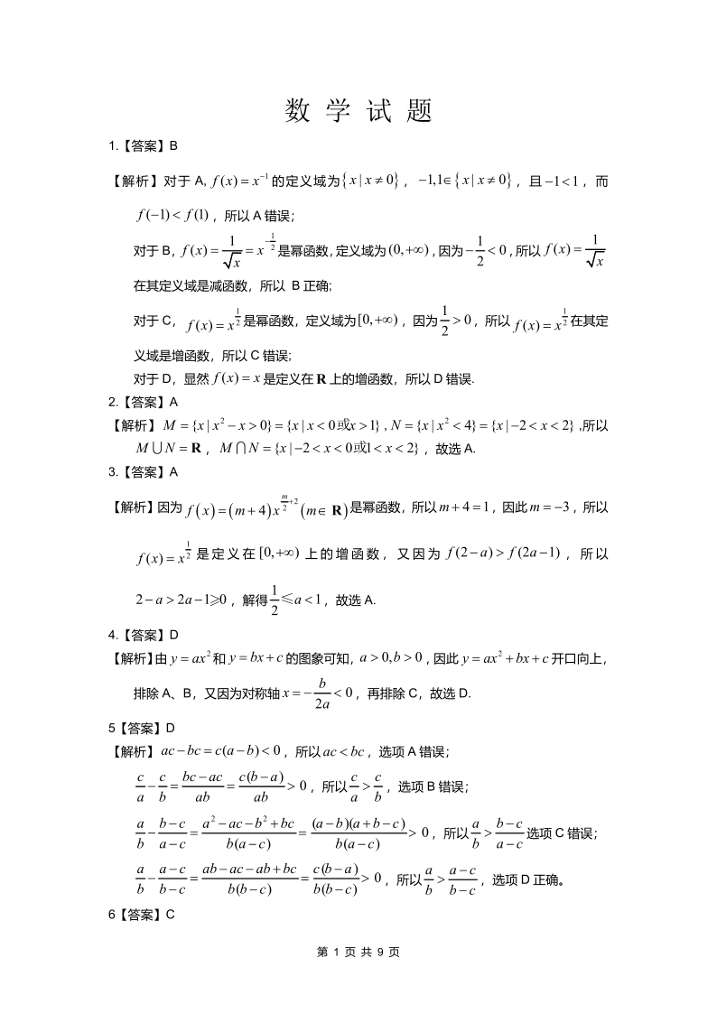 山东省名校考试联盟2024-2025学年高一上学期期中考试 数学答案