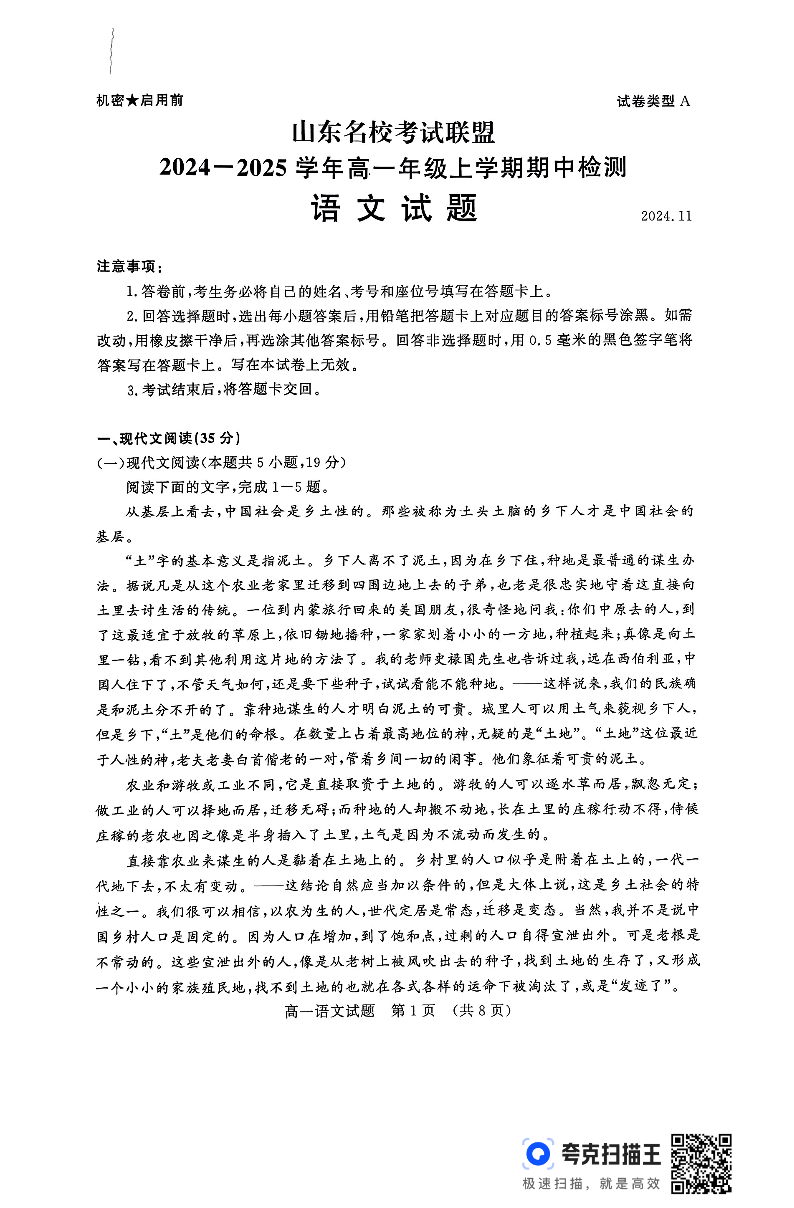山东省名校考试联盟2024-2025学年高一上学期期中考试 语文