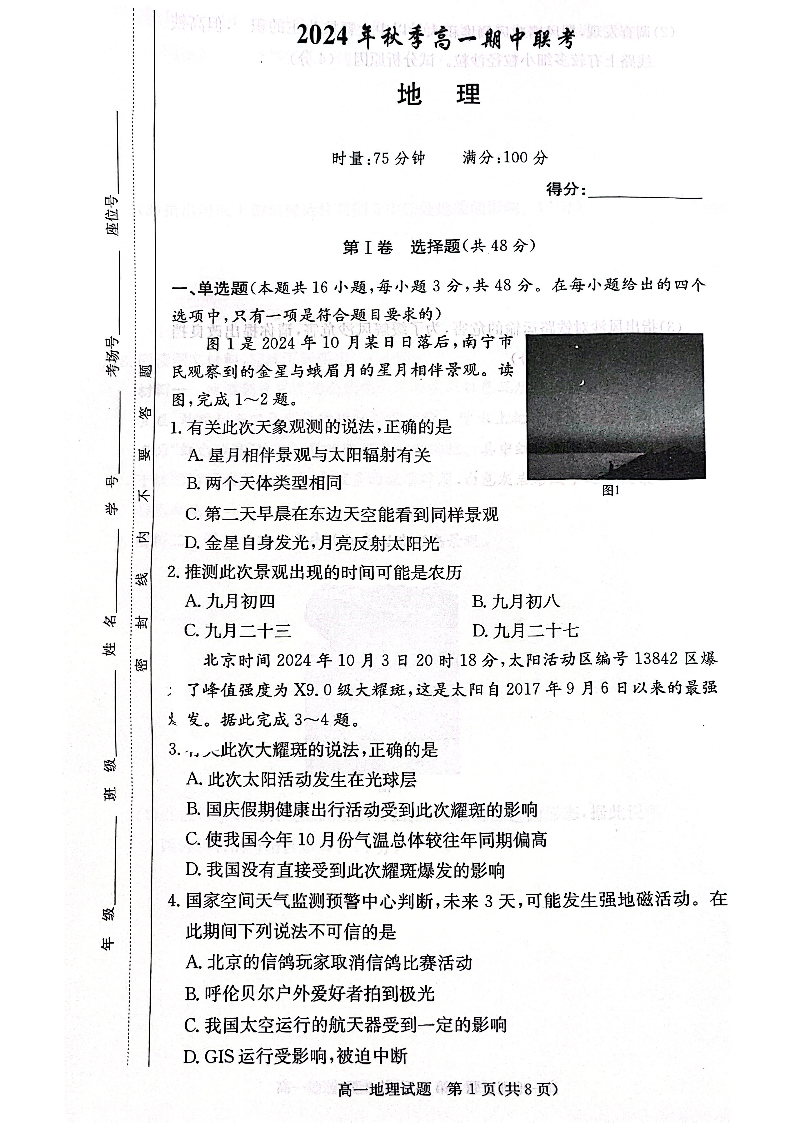 湖南省名校联考联合体2024学年高一上学期期中联考 地理