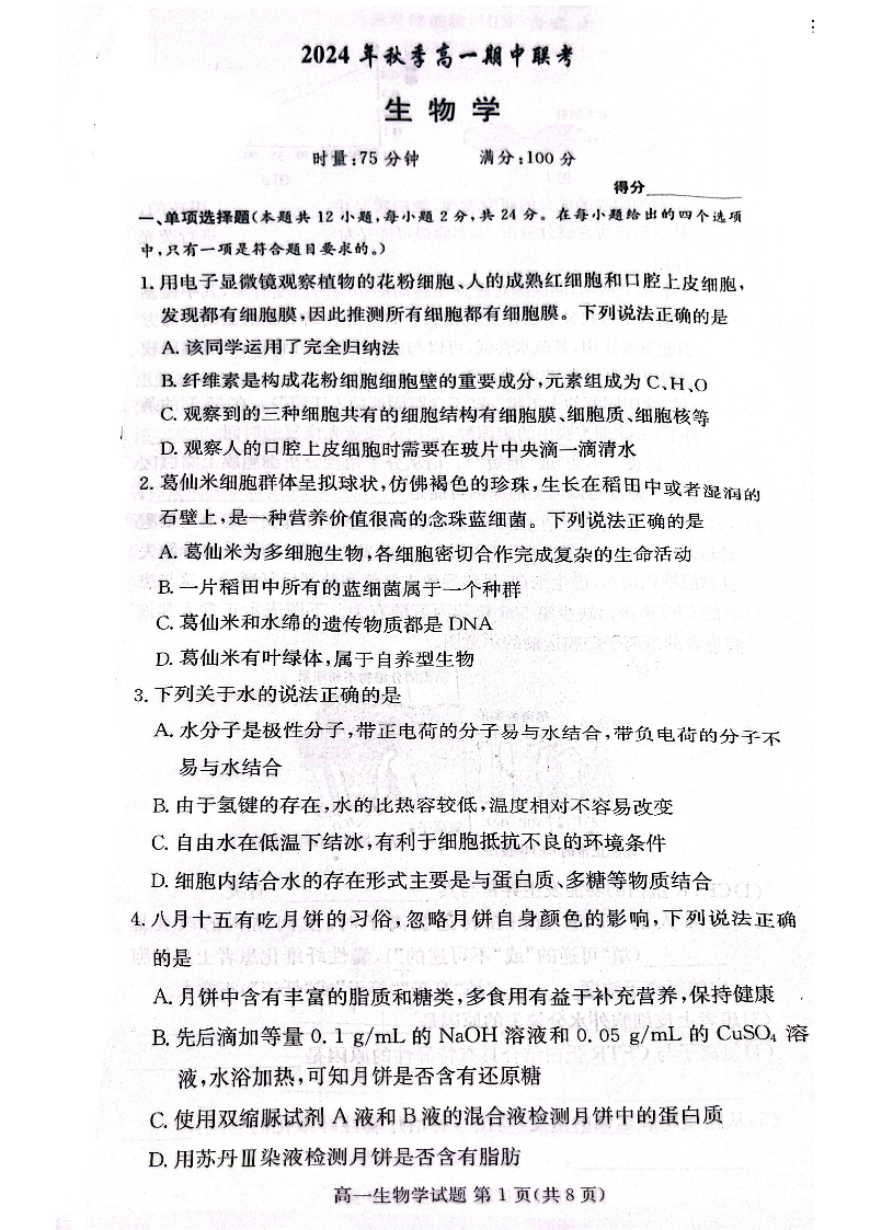 湖南省名校联考联合体2024学年高一上学期期中联考 生物