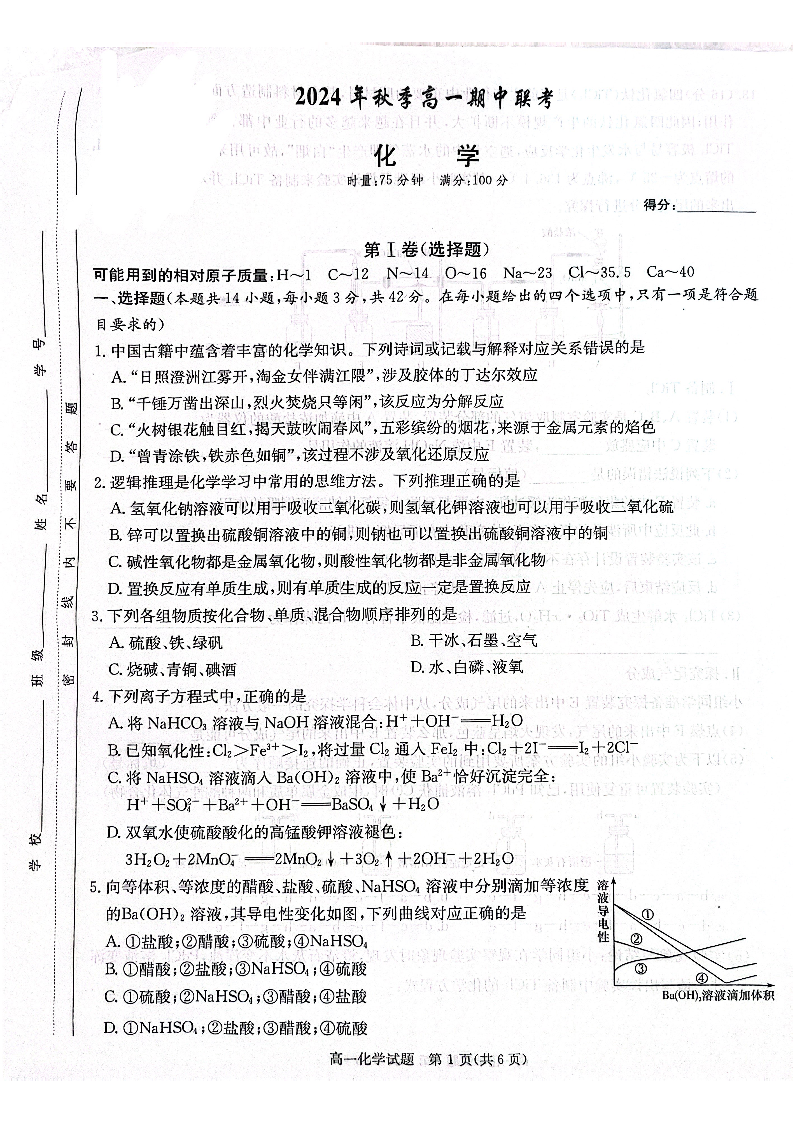 湖南省名校联考联合体2024学年高一上学期期中联考 化学