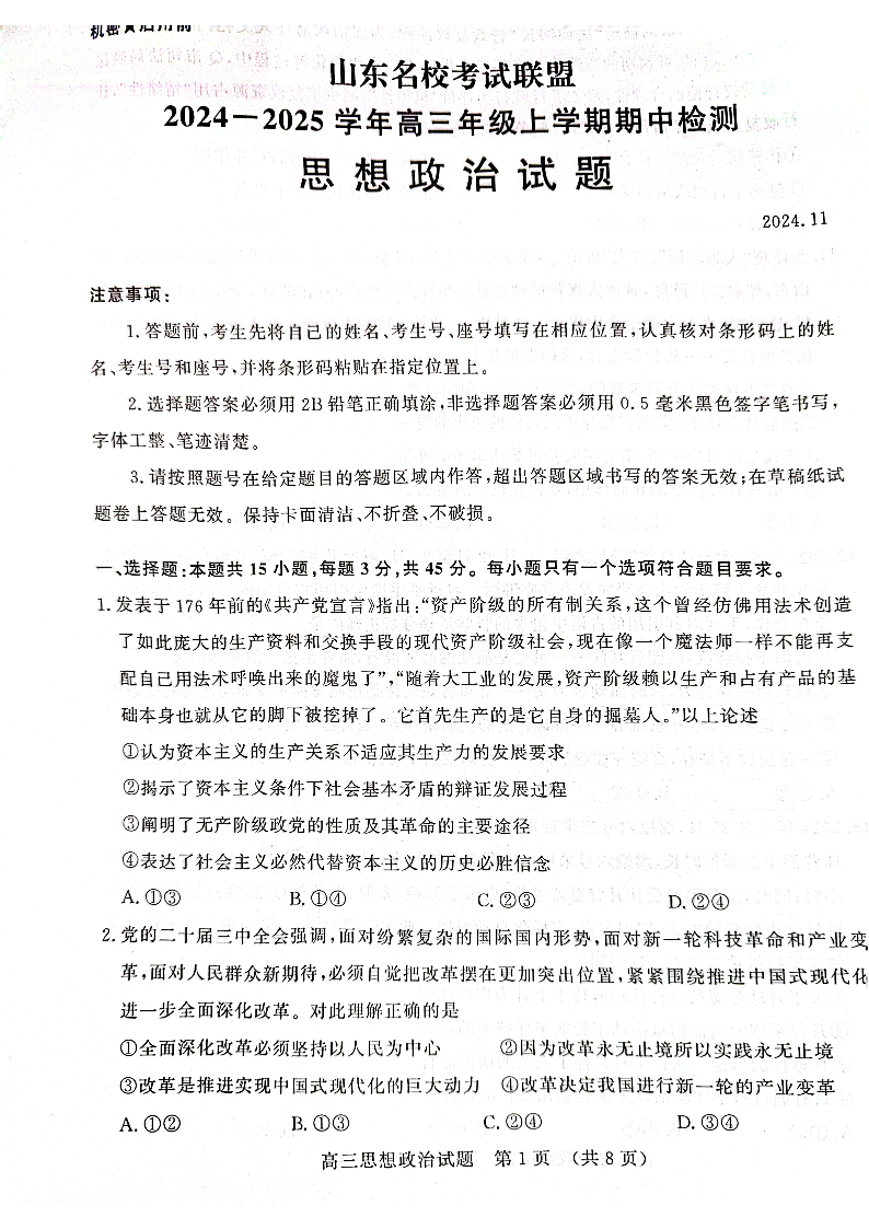山东省名校考试联盟2024-2025学年高三上学期期中考试 政治