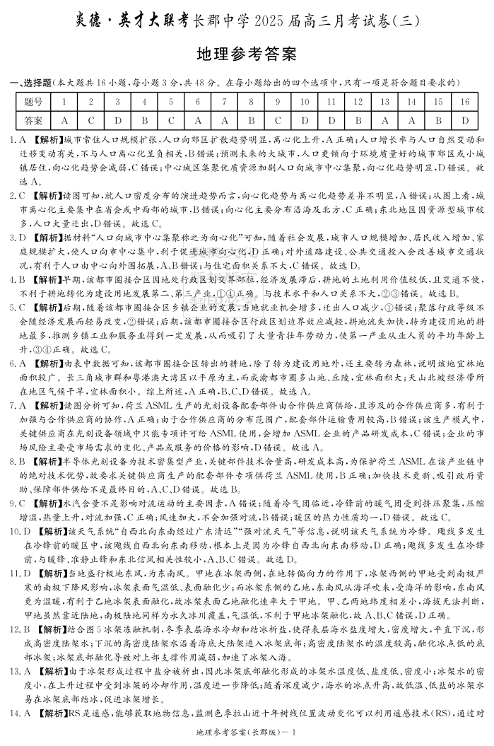 湖南省长沙市长郡中学2025届高三上学期月考卷(三)地理答案