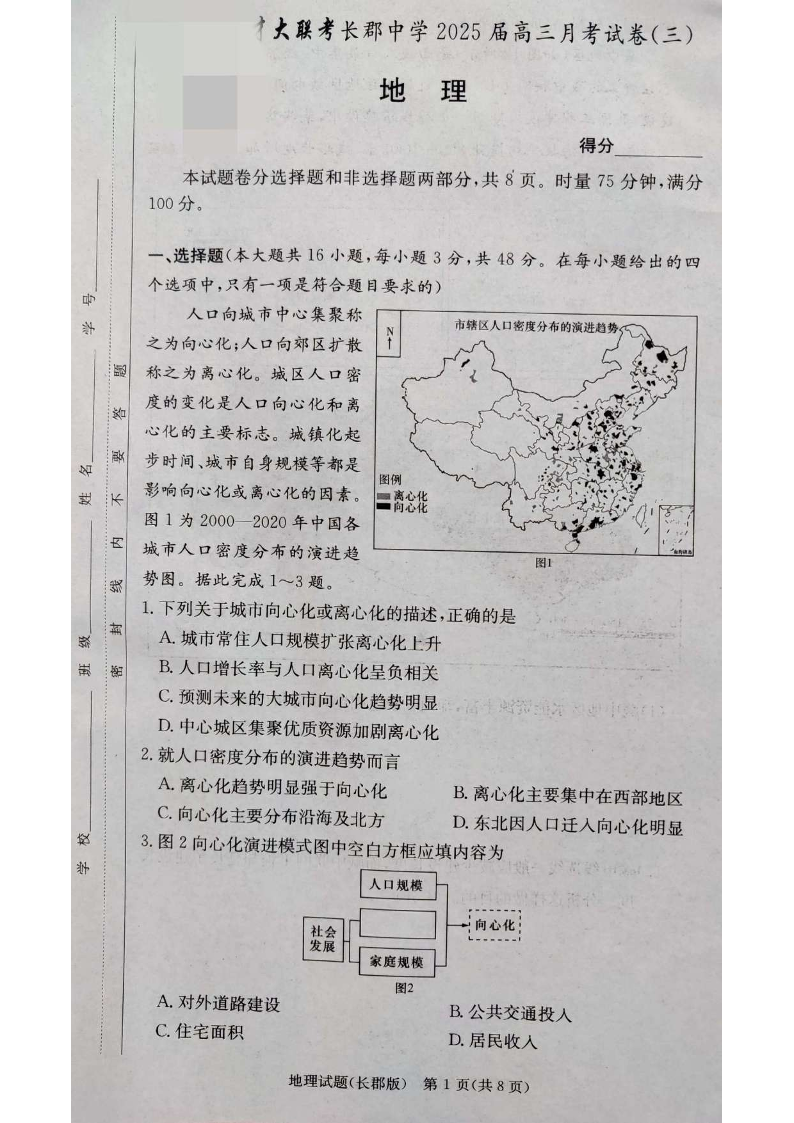 湖南省长沙市长郡中学2025届高三上学期月考卷(三)地理