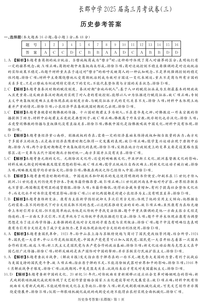 湖南省长沙市长郡中学2025届高三上学期月考卷(三)历史答案