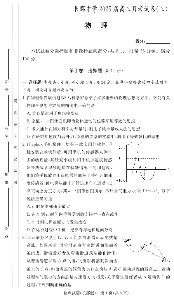 湖南省长沙市长郡中学2025届高三上学期月考卷(三)物理