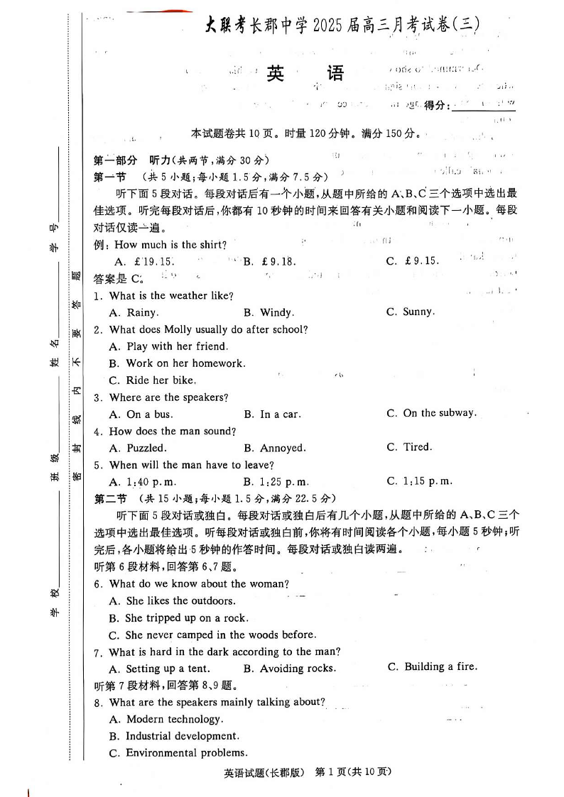 湖南省长沙市长郡中学2025届高三上学期月考卷(三)英语