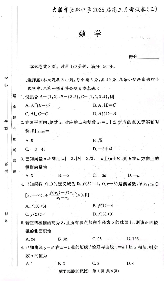 湖南省长沙市长郡中学2025届高三上学期月考卷(三)数学