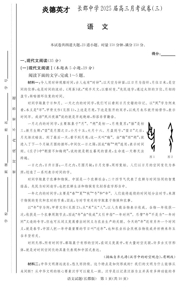 湖南省长沙市长郡中学2025届高三上学期月考卷(三)语文
