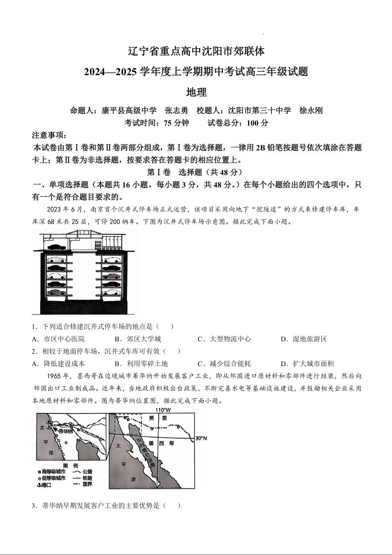 辽宁省沈阳市郊联体2025届上学期11月期中考试 地理