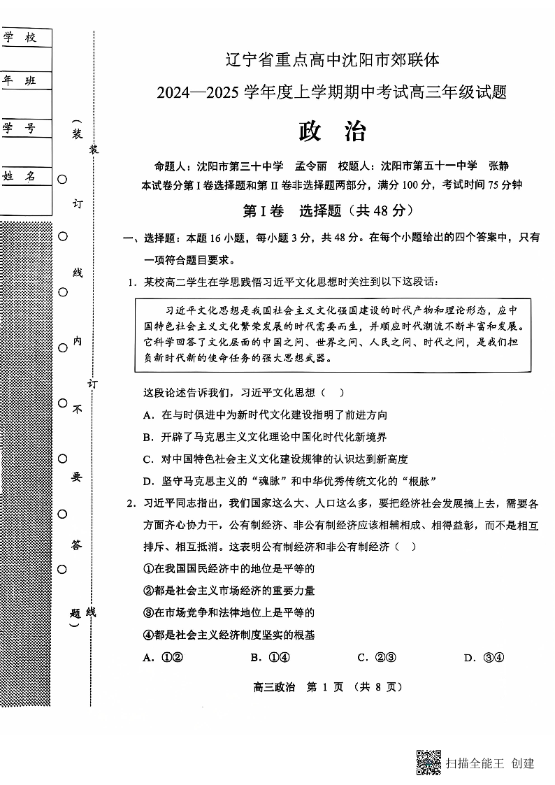 辽宁省沈阳市郊联体2025届上学期11月期中考试 政治