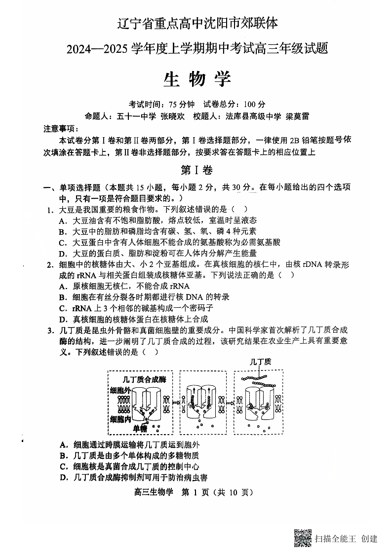 辽宁省沈阳市郊联体2025届上学期11月期中考试 生物